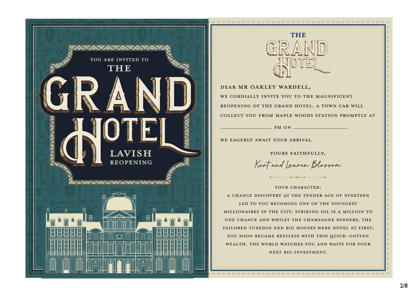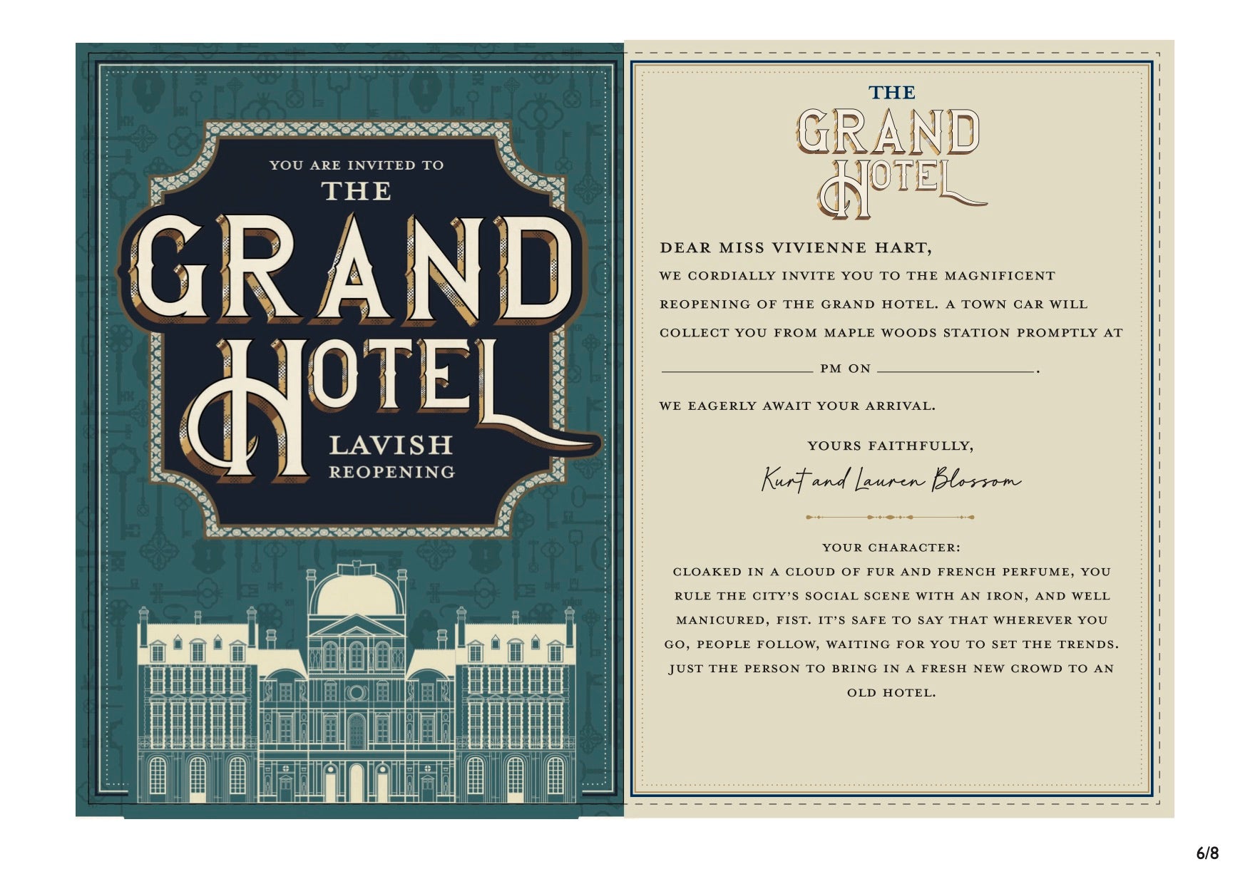 Invite your guests, set your scene and get ready to host a night of fun and intrigue. Each guest can come dressed as one of the eight characters, ready to play their role. During the evening, they must travel through the hotel solving the series of mysterious puzzles that release them from each room. The ultimate quest? To uncover the dark, hidden secret of The Grand Hotel.